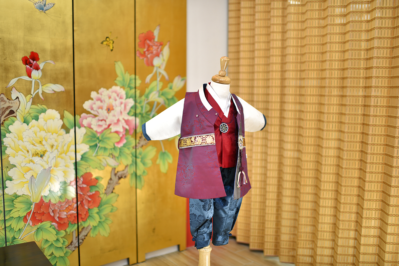 小孩宮廷韓服禮服照。貴氣款 多層次勃根地酒紅與天青石藍壓紋褲裝的貴族新式韓服配色