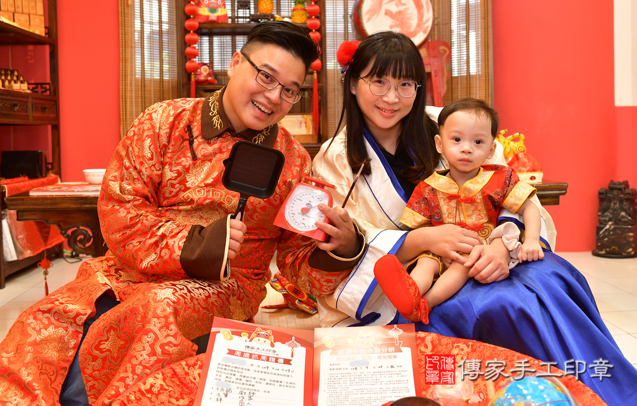王家,全家選擇(中國風古裝禮服)參加傳家嬰兒古禮抓周,活動與拍照紀念,中國風古裝禮服吉祥喜氣、象徵富貴、平安。2020/10/27