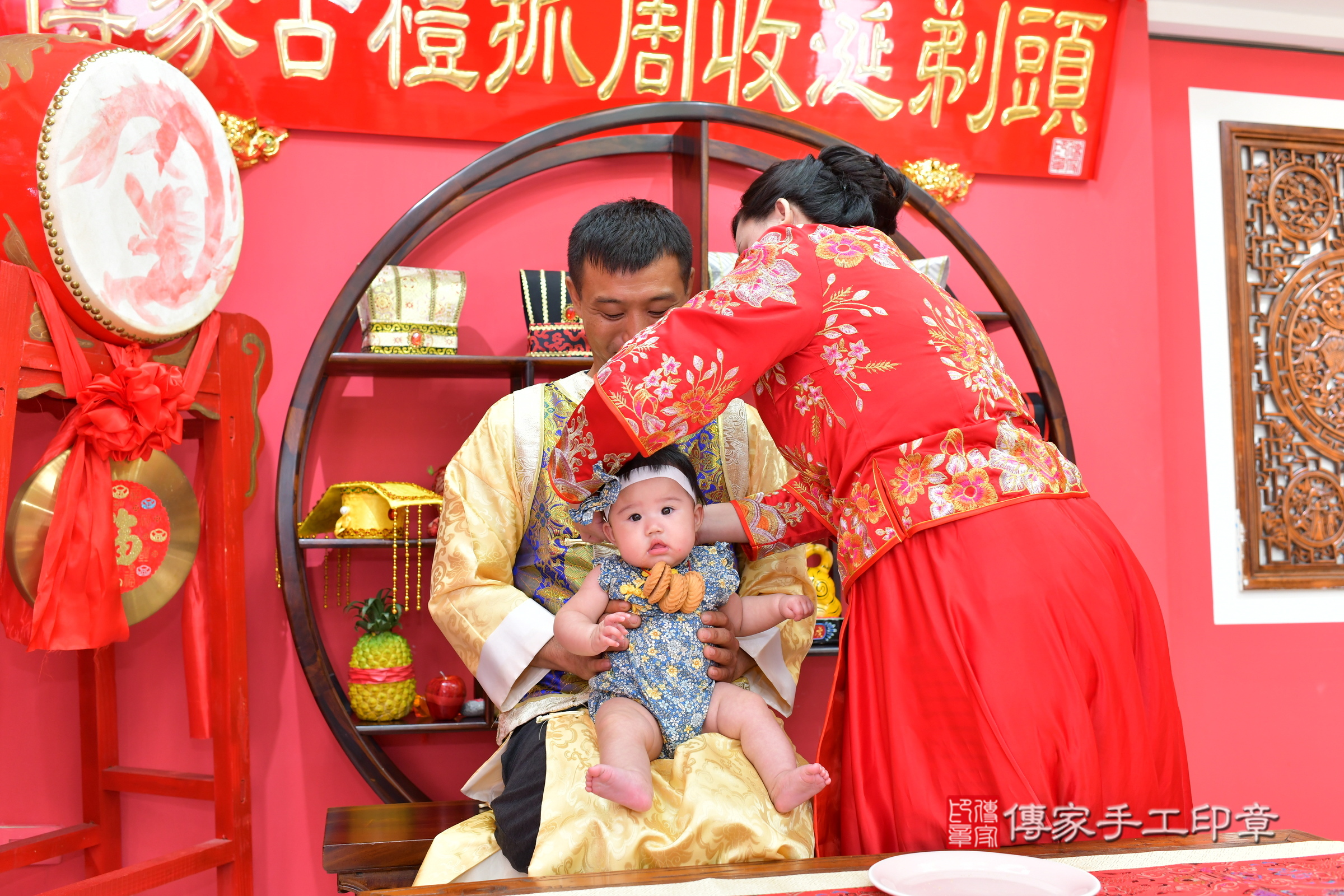 幸福的一家人在這個好日子完成了這場傳統的收涎儀式,