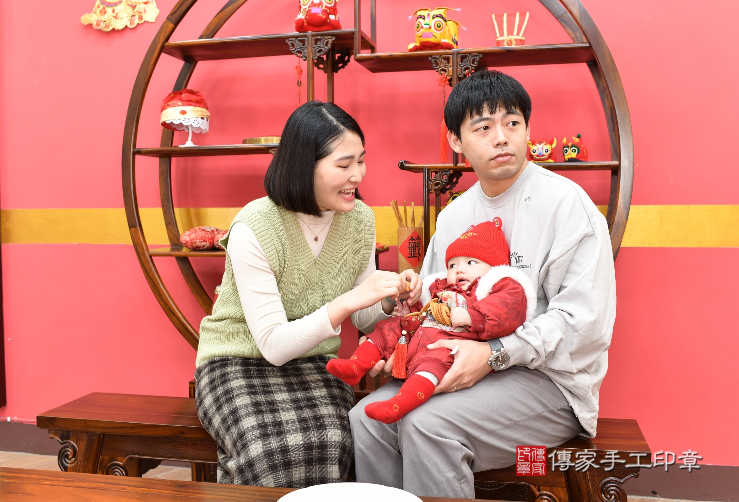 爸爸和媽媽選擇在傳家新北店傳家古禮會場為小琁寶寶舉辦收涎儀式,