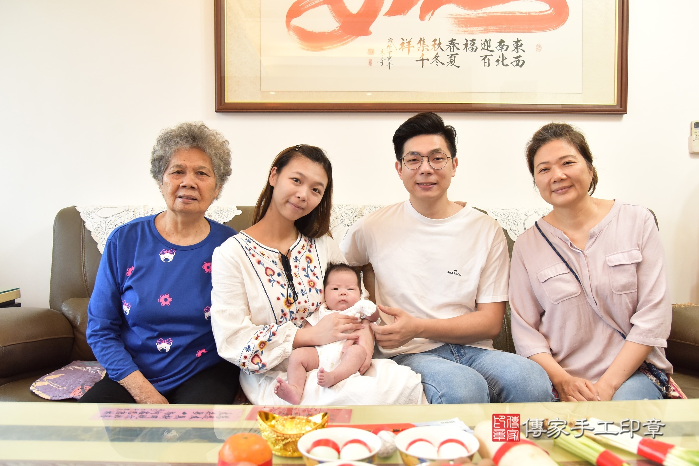寶寶滿月剃髮儀式完成,全家福合照 。
