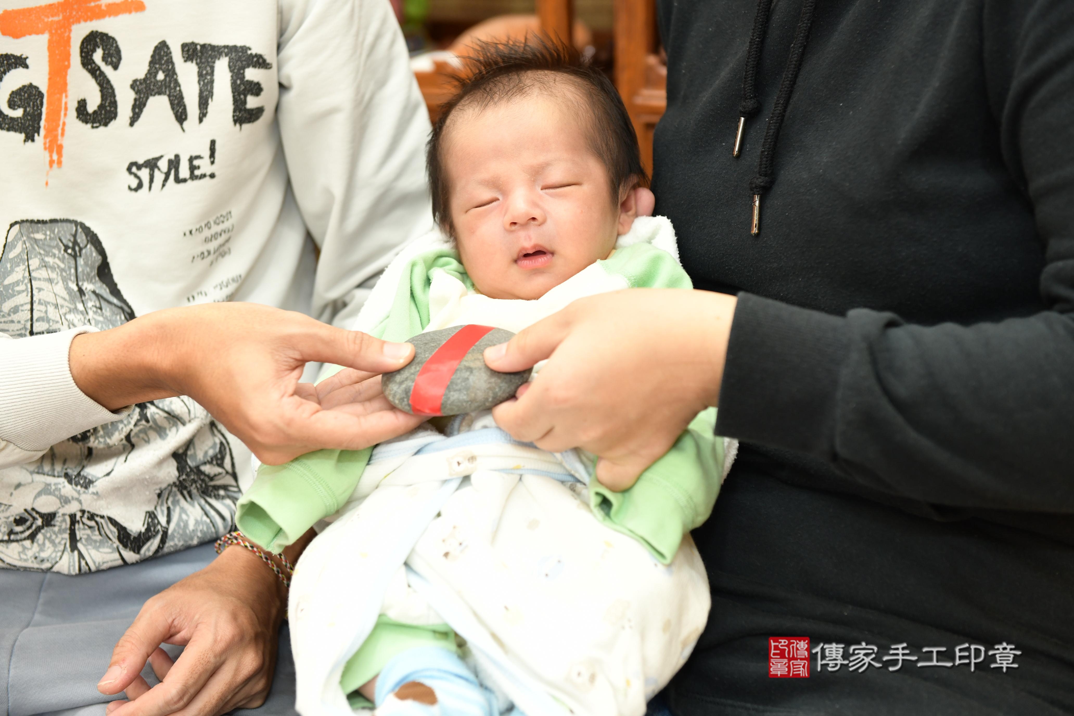 為寶寶準備的圓的石頭1個。 進行石頭祝福儀式。石頭「代表的含意:頭殼堅硬跟石頭一樣、身體硬朗、有膽量、勇敢」 讓陳寶寶長大有膽量有膽識,做大事。