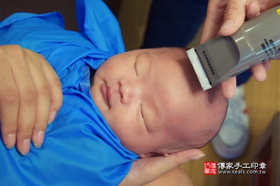寶寶要開始剃頭囉, 剃頭象徵今天從頭開始、圓圓滿滿喔~ 傳家印章有專業的剃頭儀式和剃頭人員,用心為寶貝進行滿月剃頭剃胎毛儀式和祝福吉祥話。