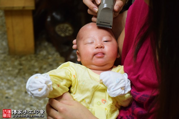 寶寶要開始剃頭囉, 剃頭象徵今天從頭開始、圓圓滿滿喔~ 傳家印章有專業的剃頭儀式和剃頭人員,用心為寶貝進行滿月剃頭剃胎毛儀式和祝福吉祥話。