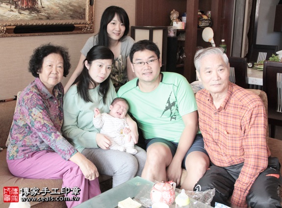 寶寶滿月剃髮儀式完成,全家福合照 。