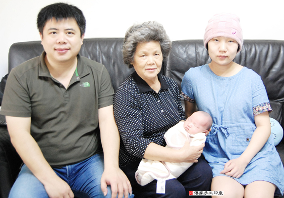 寶寶滿月剃髮儀式完成,全家福合照 。