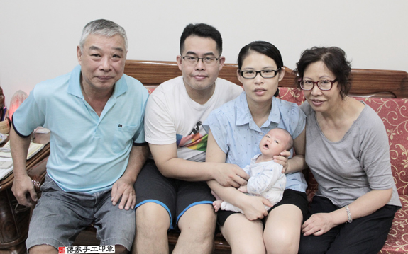 寶寶滿月剃髮儀式完成,全家福合照 。
