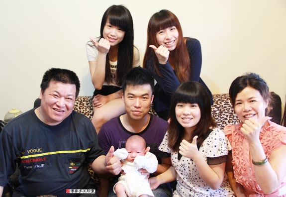 寶寶滿月剃髮儀式完成,全家福合照 。