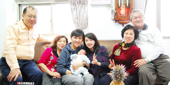 寶寶滿月剃髮儀式完成,全家福合照 。