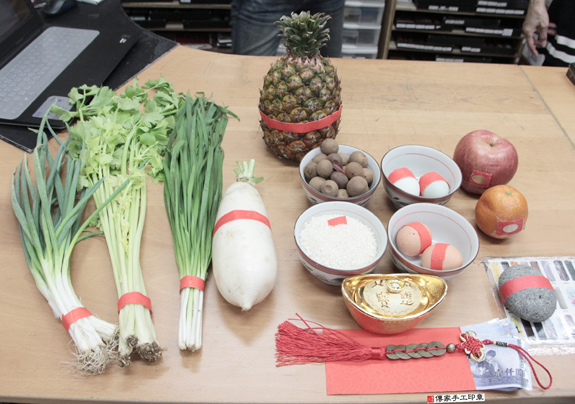 今天:2015年的12月09日 天氣:晴 剃頭小組:小韻&小杋 以下是我們傳家手工印章特地幫寶寶準備的豐盛十禮唷! 為范寶寶準備一顆橘子。 橘子「代表的含意:大吉大利」 讓寶寶大吉大利~事事都順心唷! 為范寶寶準備的韭菜一把。 韭菜一小把。「代表的含意:長壽、長久、健康吃120歲」。