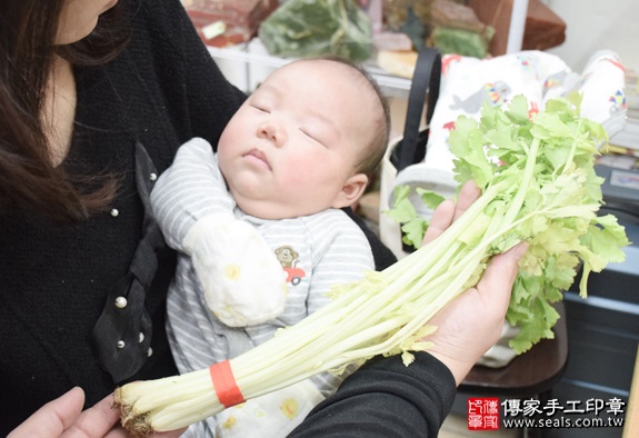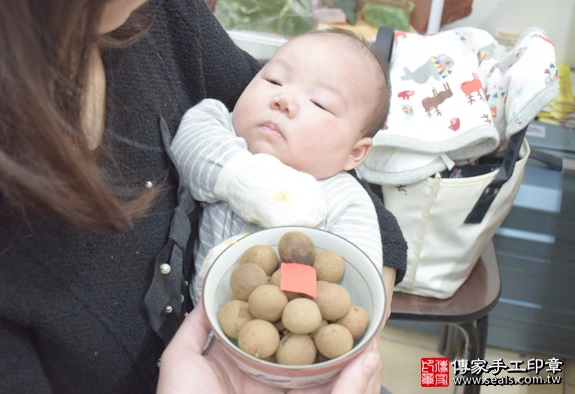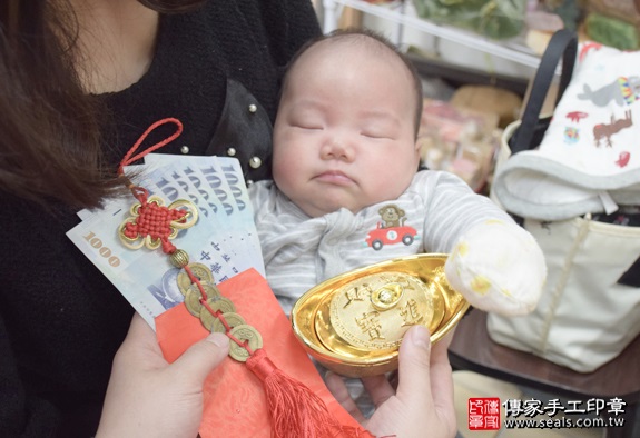 今天:2016年的03月12日 天氣:晴 剃頭小組:小鈺&小琳 今天是要幫可愛的李寶寶剃頭的好日子唷!! 爸爸媽媽專程來到店裡,請我們幫寶寶舉行剃頭的儀式 以下是我們傳家手工印章特地幫寶寶準備的豐盛十禮唷! 在儀式開始前跟最愛我的家人拍一張溫馨美滿又快樂的全家福 為李寶寶準備煮熟的圓的雞蛋兩顆。 煮熟雞蛋2個「代表的含意:寶寶生臉蛋英俊、女生臉蛋美麗漂亮」。 讓寶寶長大是個英俊瀟灑風度翩翩的型男帥哥喔! 為李寶寶準備煮熟的圓的鴨蛋兩顆。 煮熟鴨蛋2個 「代表的含意:嬰兒的身形跟鴨蛋的形狀一樣、身材健美」。 讓寶寶長大頭好壯壯,身材一級棒! 為李寶寶準備的圓的石頭1個。 石頭「代表的含意:頭殼堅硬跟石頭一樣、身體硬朗、有膽量、勇敢」 讓寶寶長大有膽量有膽識,要做大事唷! 為李寶寶準備一大碗桂圓。 桂圓「代表的含意:桂圓的台語發音,跟「貴人」一樣,象徵孩子有貴人相助」 讓寶寶身邊都環繞著貴人呦~~ 為李寶寶準備一顆橘子。 橘子「代表的含意:大吉大利」 讓寶寶大吉大利~事事都順心唷! 為李寶寶準備一顆蘋果。 蘋果「代表的含意:平平安安」 讓寶寶健健康康平安長大唷! 為李寶寶準備的韭菜一把。 韭菜一小把。「代表的含意:長壽、長久、健康吃120歲」。 讓寶寶長命百歲唷! 為李寶寶準備的芹菜一把。 芹菜一小把。「代表的含意:勤勞、積極、努力向上」。 寶寶長大要幫爸爸媽媽分擔經濟,分擔家計喔!! 為李寶寶準備漂亮的蔥一把。 蔥:象徵「孩子聰明會念書」。 爸爸媽媽我是一個聰明的小孩以後考試都100分喔~~ 為李寶寶準備的大蘿蔔。 蘿蔔「代表的含意:蘿蔔就是好彩頭,象徵孩子一生好運源源不絕」 讓寶寶一輩子都可以好運滿滿喔! 鳳梨「代表的含意:鳳梨就是旺旺來,象徵孩子一生好運旺旺來」 讓寶寶一輩子都可以一路旺到底喔! 為李寶寶準備的1000元大鈔,五帝錢和紅包袋。 紅包袋裡面裝千元大鈔:象徵「孩子能賺大錢」, 五帝錢:象徵「代表盛世吉祥和富貴」。 爸爸媽媽我長大一定會賺很多很多的錢錢讓你們享福喔! 李寶寶要開始剃頭囉, 剃頭象徵今天從頭開始、圓圓滿滿喔。 阿姨你看我剃頭是不是好乖好勇敢啊! 各位叔叔阿姨在等我一下下等等就會出現又酷又炫的小帥哥喔 李寶寶滿月剃髮儀式完成囉~ 傳家手工印章祝福李寶寶平安健康、聰明長大! 也祝福李寶寶全家平安健康喜樂唷~ 還有許多全家福和剃髮花絮照片,就交由爸爸媽媽自己收藏和分享囉, 傳家不會公開寶寶的名字和資料,大家就看到這邊就好囉! 以上照片由李寶寶家長同意公開使用,版權所有。 歡迎爸爸媽媽來電預約寶寶剃髮服務 (包含專業拍照整個過程), 傳家會用心為您的孩子服務和祝福。 免費到府嬰兒胎毛理髮:製作臍帶印章、胎毛筆、嬰兒三寶。 歡迎家長來電預約。 台北店:新北市永和區永貞路129號。聯絡電話:02-2922-6422。 (服務台北、新北、基隆、桃園、宜蘭等地區) 新竹店:新竹市經國路三段71號。聯絡電話:03-530-4066。 (服務新竹、苗栗、新竹科學園區、苗栗科學園區等五大科學園區) 台中店:台中市北區忠明路502-5號。聯絡電話:04-2202-3030。 (服務台中以南、彰化、南投、雲李、嘉義、台南、高雄、屏東等地區)
