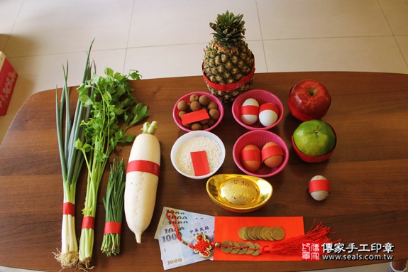 煮熟雞蛋2個「代表的含意:周寶寶生臉蛋英俊、女生臉蛋美麗漂亮」。