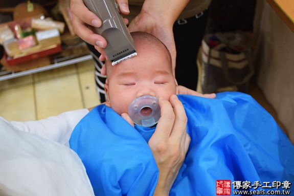 劉寶寶要開始剃頭囉,剃頭象徵今天從頭開始、圓圓滿滿喔。