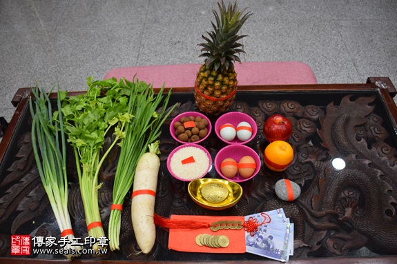 這是家人特別幫林寶寶準備的剃頭十禮唷! 每一樣都有吉祥話的祝福喔!.jpg)
