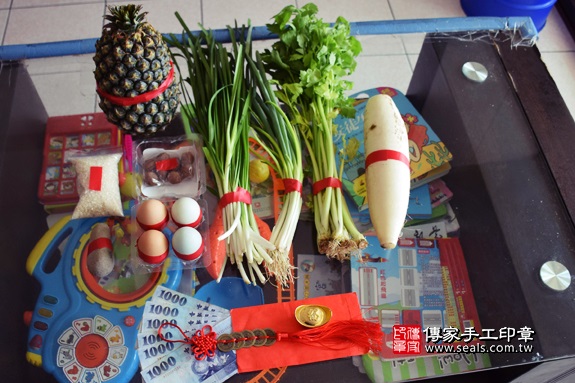 這是家人特別幫綿綿準備的剃頭十禮唷!每一樣都有吉祥話的祝福喔!.jpg)