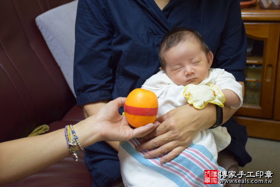 為林寶寶準備一顆橘子。橘子「代表的含意:大吉大利」