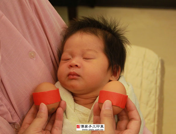 煮熟鴨蛋2個 「代表的含意:嬰兒的身形跟鴨蛋的形狀一樣、身材健美)。