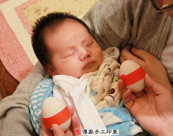 煮熟鴨蛋2個 「代表的含意:嬰兒的身形跟鴨蛋的形狀一樣、身材健美)。