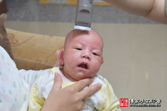 胡寶寶要開始剃頭囉, 剃頭象徵今天從頭開始、圓圓滿滿喔~