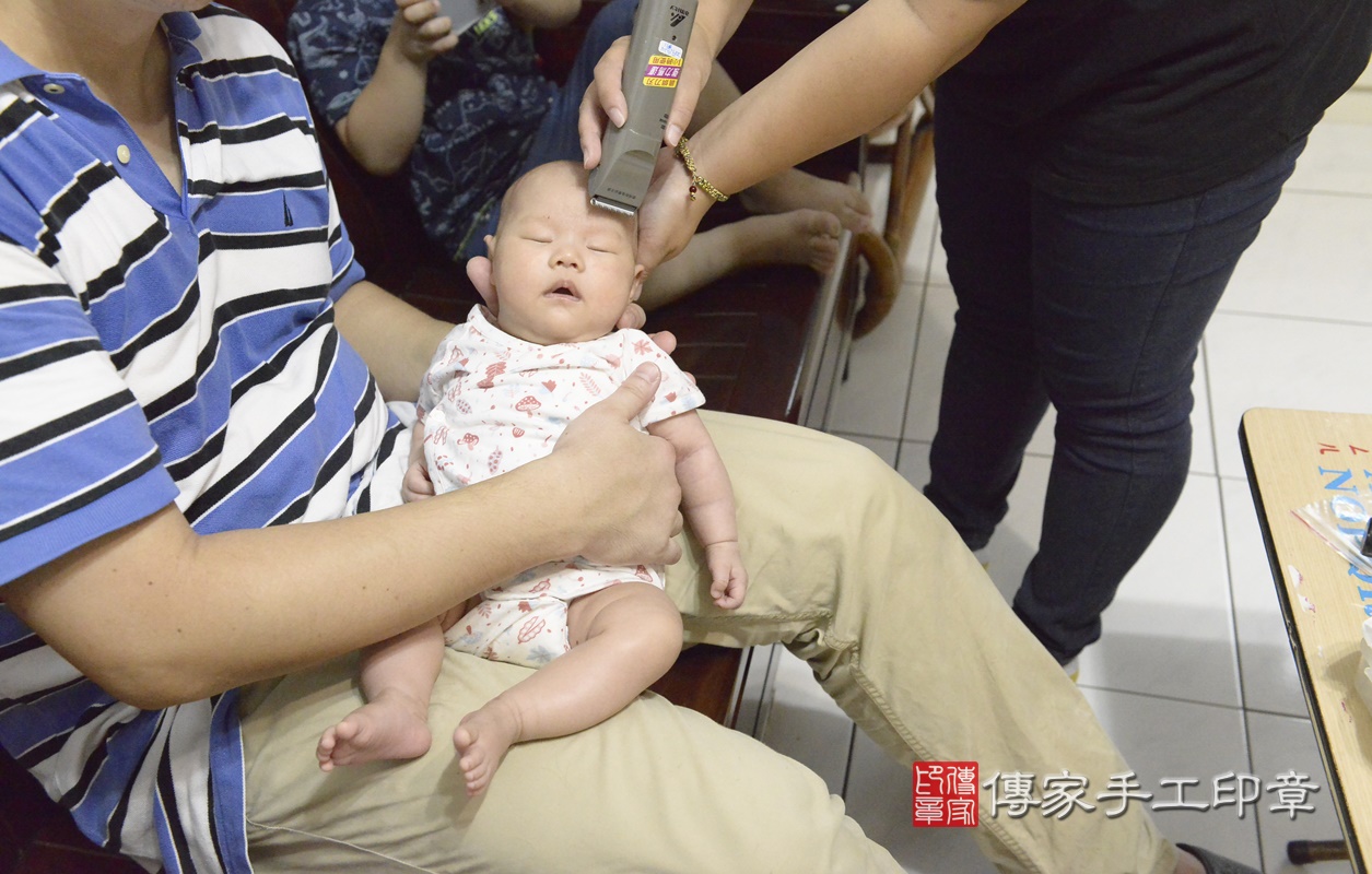 張寶寶要開始剃頭囉, 剃頭象徵今天從頭開始、圓圓滿滿喔~