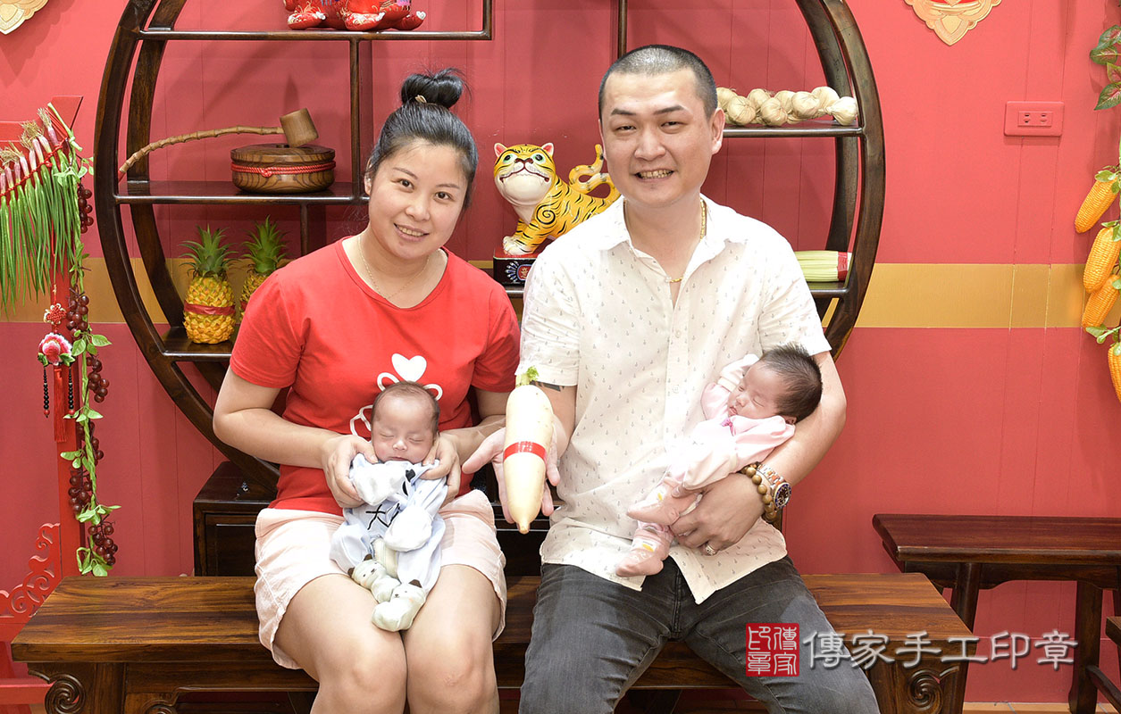 龍鳳胎黃寶寶(桃園市八德區嬰兒寶寶滿月剃頭理髮、嬰兒剃胎毛儀式吉祥話)。中國風會場。拍照、證書。★購買「臍帶章、肚臍章、胎毛筆刷印章」贈送:剃頭、收涎、抓周,三選一。 2020.08.01