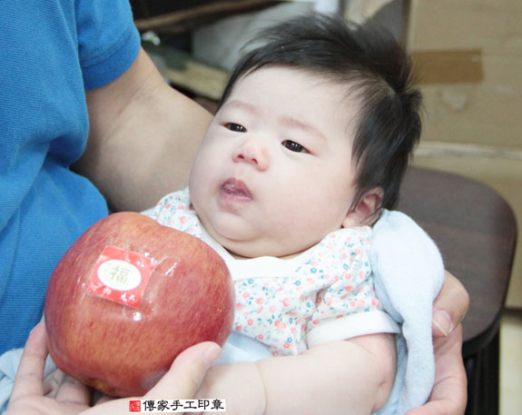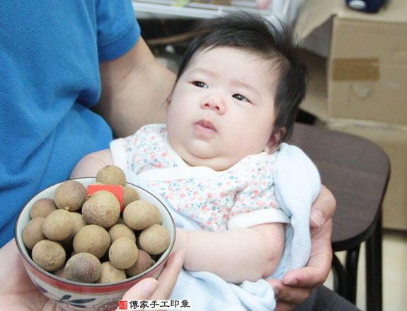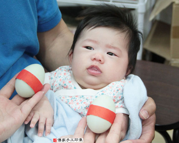 (服務台北、新北、基隆、桃園、宜蘭等地區) 新竹店:新竹市經國路三段71號。聯絡電話:035-304-066。 (服務新竹、苗栗、新竹科學園區、苗栗科學園區等五大科學園區) 台中店:台中市北區忠明路502-5號。聯絡電話:04-2202-3030。 (服務台中以南、彰化、南投、雲林、嘉義、台南、高雄、屏東等地區) 煮熟雞蛋2個「代表的含意:男生臉蛋英俊、女生臉蛋美麗漂亮)。 為葉寶寶準備煮熟的圓的鴨蛋兩顆。 煮熟鴨蛋2個 「代表的含意:嬰兒的身形跟鴨蛋的形狀一樣、身材健美)。 為葉寶寶準備一碗滿滿的米。 米。「代表的含意:一生有飯吃,豐衣足食,不愁吃穿」 為葉寶寶準備一大碗桂圓。 桂圓「代表的含意:桂圓的台語發音, 以後會有好多好多的貴人可以幫助寶寶喔 為葉寶寶準備的蘋果一顆。 蘋果一顆。「代表的含意:平平安安長大」。 為葉寶寶準備一顆橘子。 橘子「代表的含意:大吉大利」 為葉寶寶準備的韭菜一把。 韭菜一小把。「代表的含意:長壽、長久、健康吃120歲」。 為葉寶寶準備的芹菜一把。 芹菜一小把。「代表的含意:勤勞、積極、努力向上」。 為葉寶寶準備的鳳梨。 鳳梨「代表的含意:鳳梨就是旺旺來,象徵孩子一生好運旺旺來」 為葉寶寶準備的1000元大鈔,五帝錢和紅包袋。 紅包袋裡面裝千元大鈔:象徵「孩子能賺大錢」, 五帝錢:象徵「代表盛世吉祥和富貴」。 葉寶寶要開始剃頭囉, 剃頭象徵今天從頭開始、圓圓滿滿喔。 還有許多全家福和剃髮花絮照片,礙於隱私,看到這邊就好囉! 傳家手工印章祝福葉寶寶一起快快樂樂、平安健康長大!