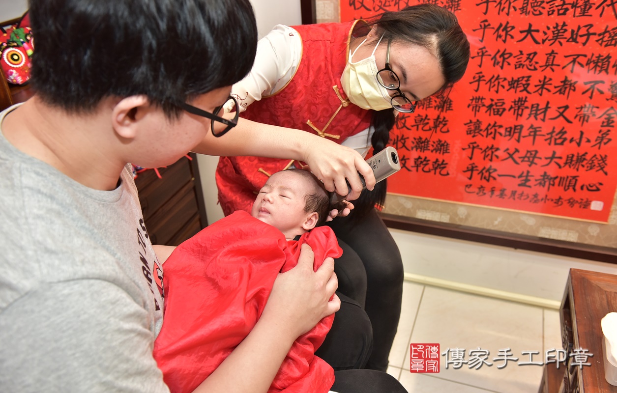張寶寶要開始剃頭囉, 剃頭象徵今天從頭開始、圓圓滿滿喔~