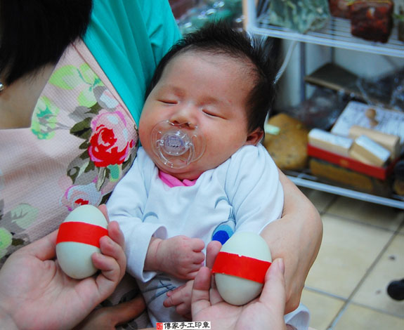 煮熟鴨蛋2個 「代表的含意:嬰兒的身形跟鴨蛋的形狀一樣、身材健美)。