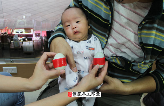 傳家手工印章為另一位吳寶寶準備煮熟的圓的雞蛋兩顆。