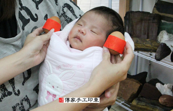 傳家手工印章為呂寶寶準備煮熟的圓的雞蛋兩顆。