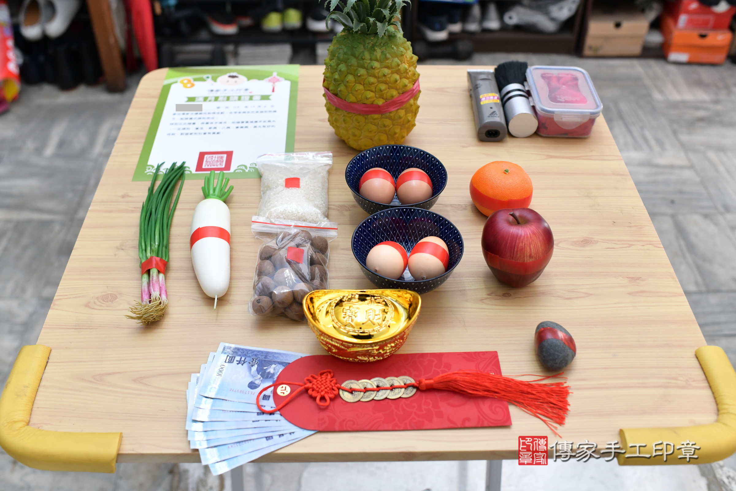 傳家準備十樣物品,表示十全十美,剃頭儀式即將開始~