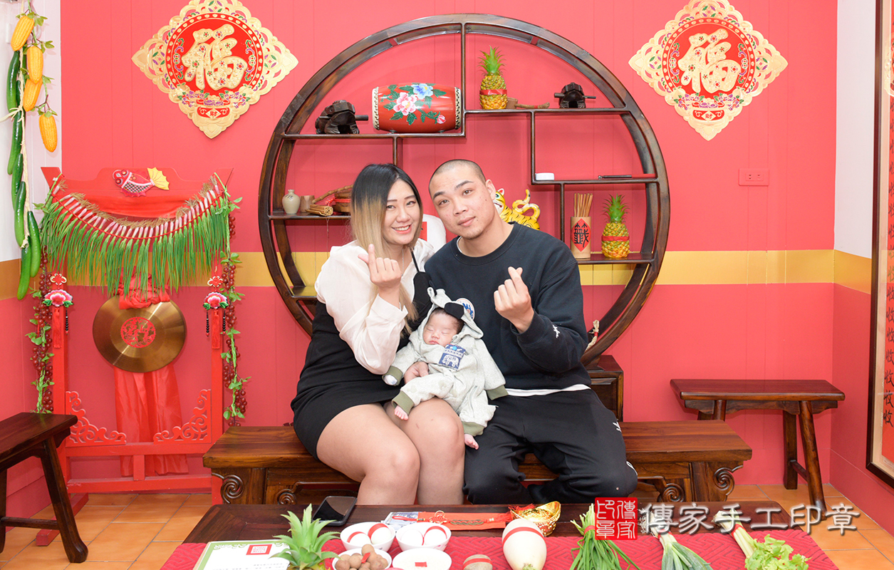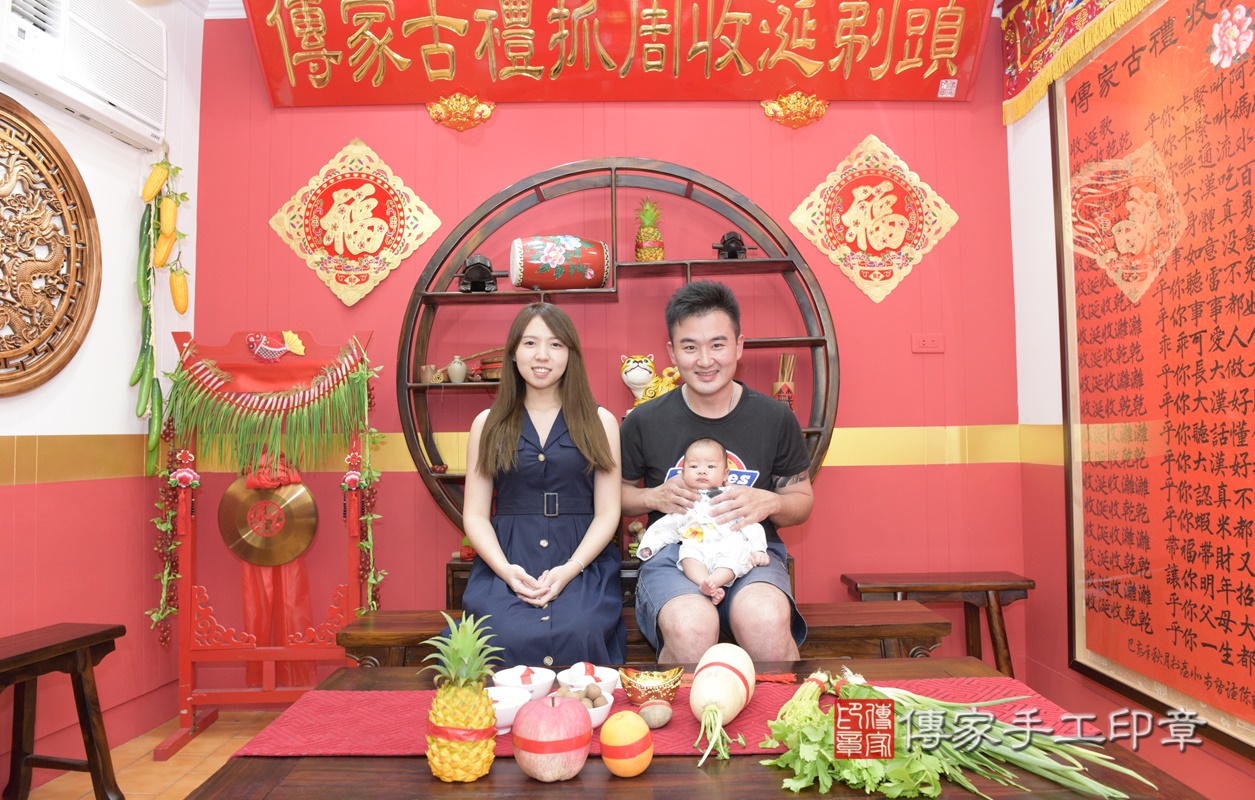 桃園會場,寶寶完成滿月剃頭後,全家人拍照紀念。