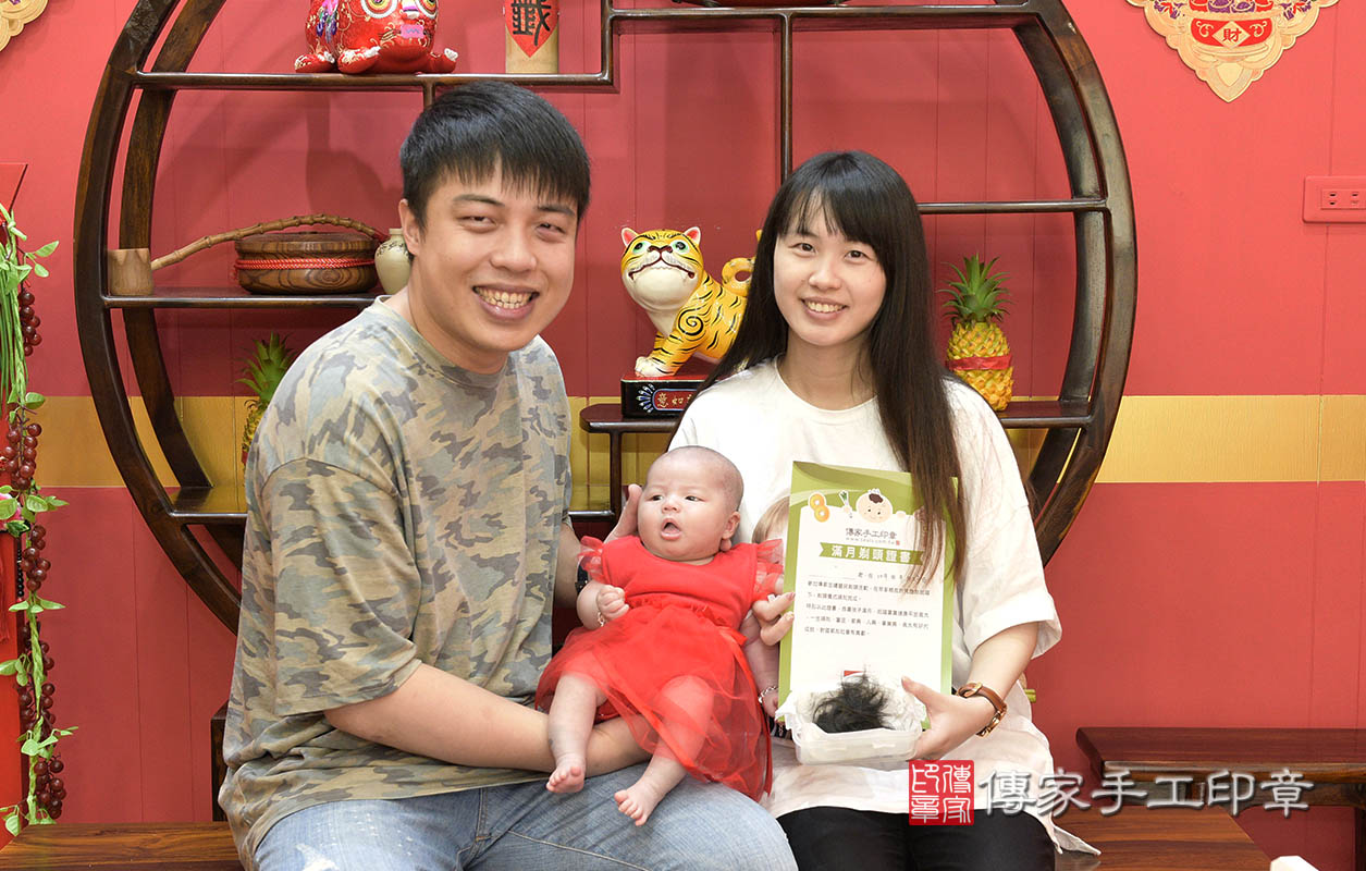 桃園會場,寶寶完成滿月剃頭後,全家人拍照紀念。