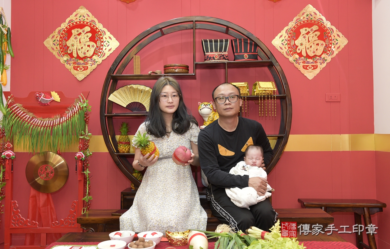 桃園會場,寶寶完成滿月剃頭後,全家人拍照紀念。