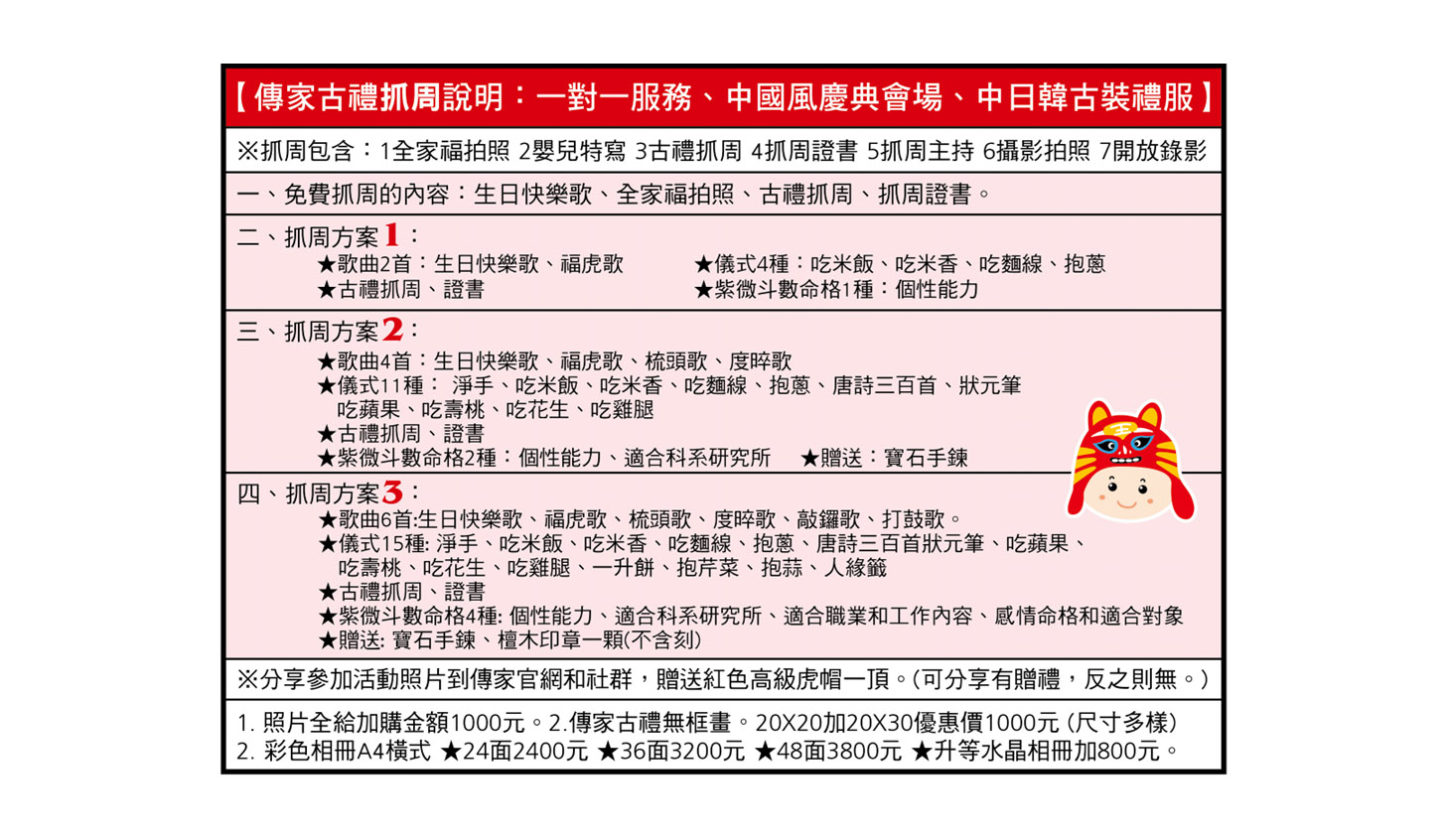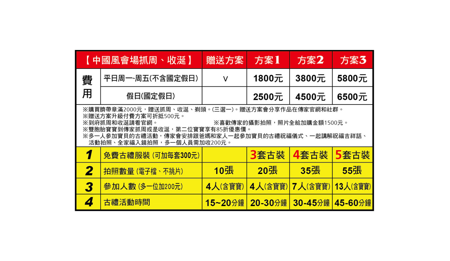 單美式抓周,與美式+中式抓周組合,方案時段,費用金額對照表。
