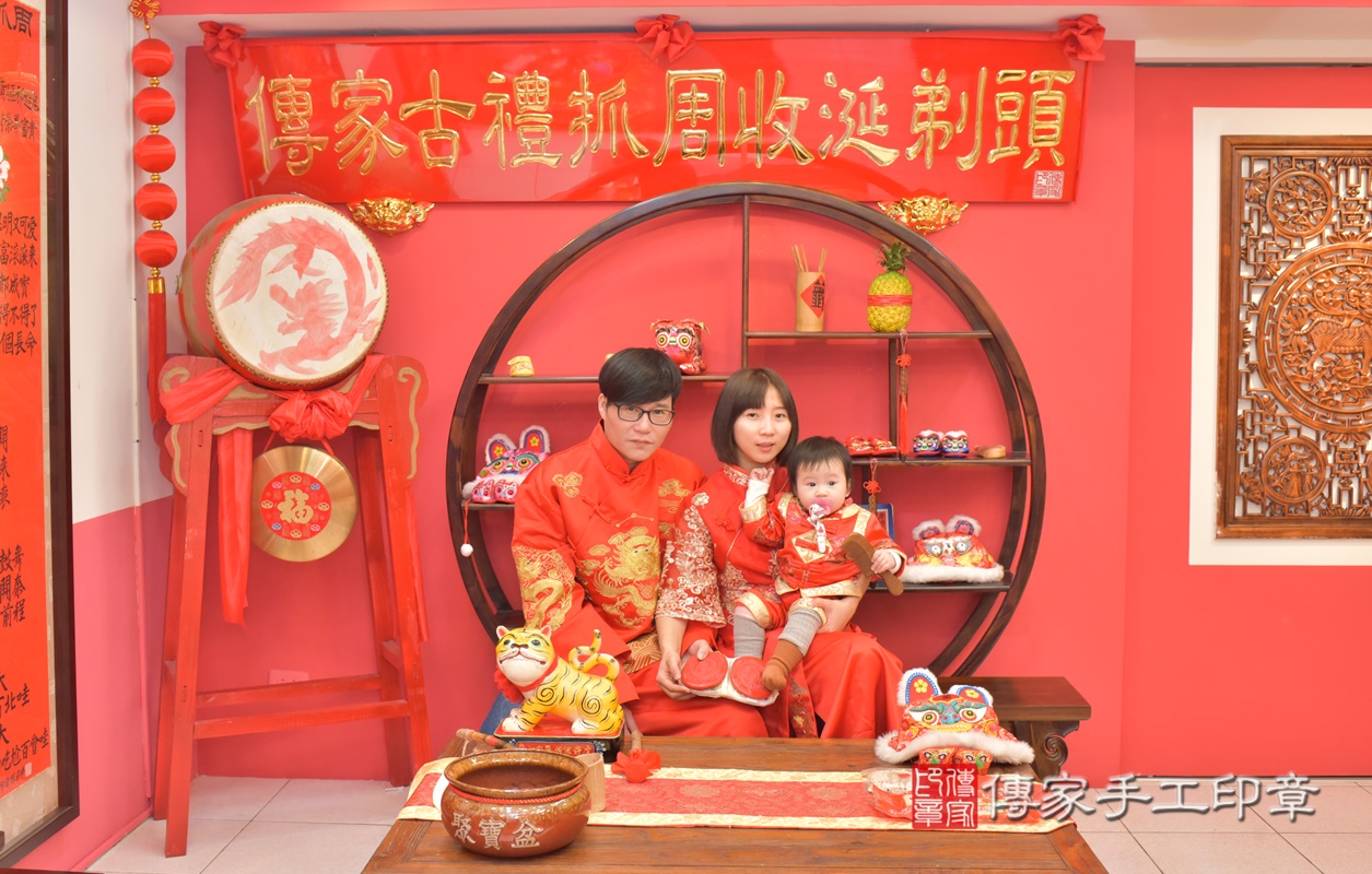 台中市北區郭寶寶抓周推薦:傳家台中店抓周度脺中國風會場,嬰兒古禮抓周流程儀式吉祥話、抓周道具物品24種、拍照。抓周證書。2021.01.01