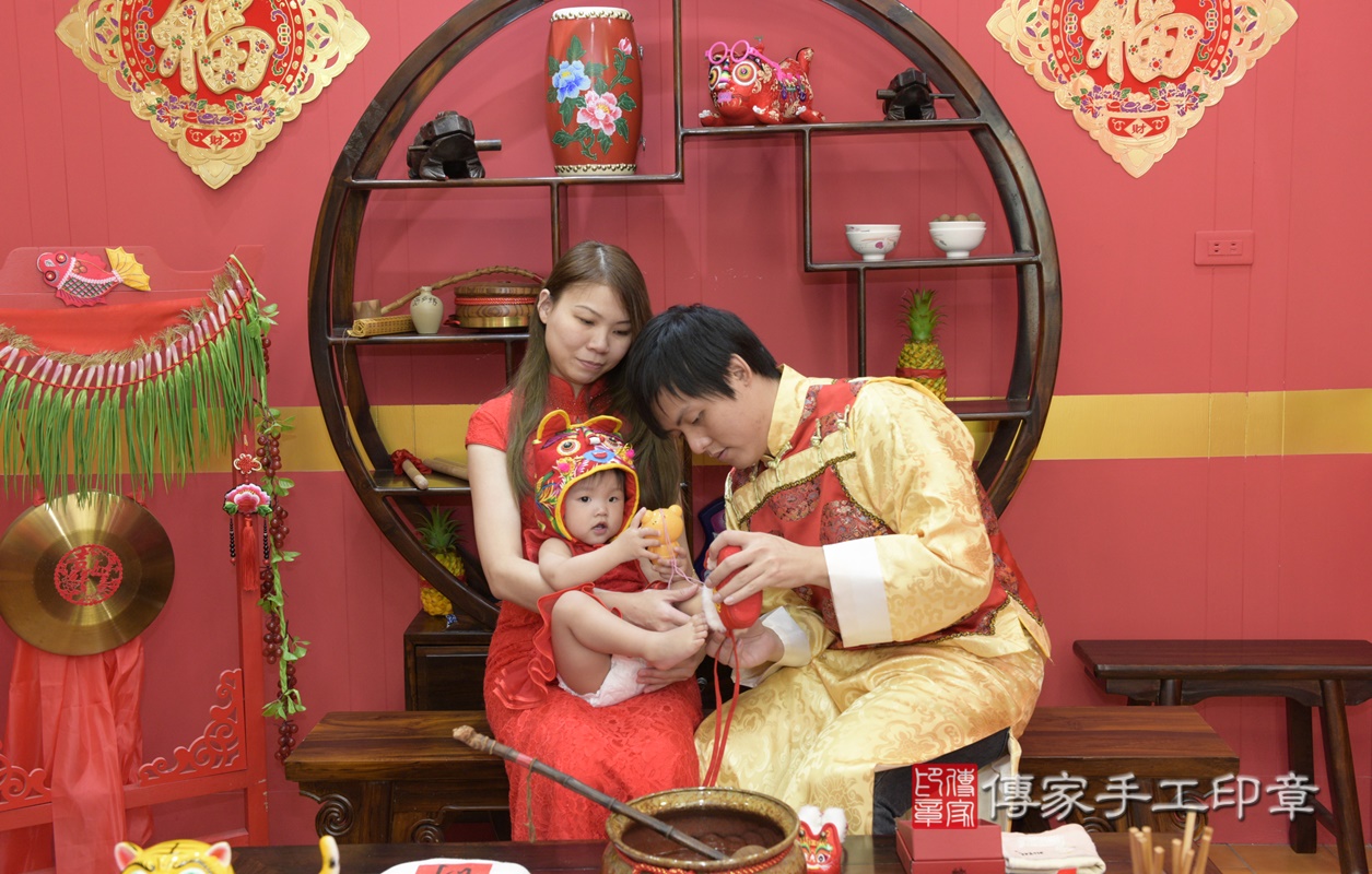 八德區許寶寶抓周儀式【度晬歌、(腳踩紅龜糕)】朗誦祝福:古禮祝福寶寶健康平安長大。腳踩紅龜糕的儀式,是台灣古禮抓周的重要儀式之一。桃園店抓周。