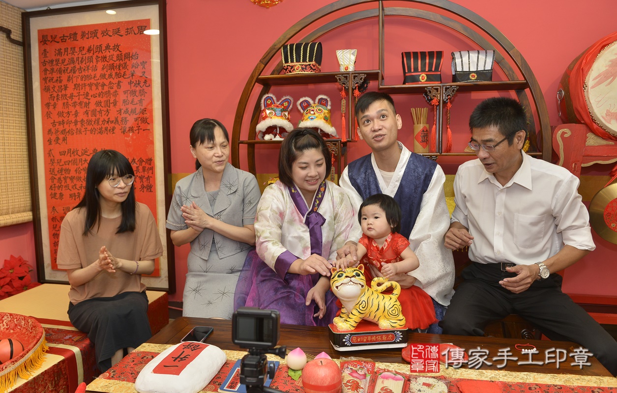 永和區劉寶寶抓周儀式【福虎歌】朗誦祝福:虎爺保佑寶寶吉祥,趨吉避凶。在中國和台灣,虎爺是兒童的守護神,週歲有虎爺保佑,可以象徵吉祥平安。新北店抓周。