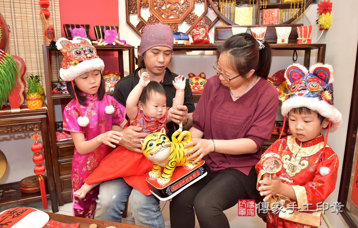 香山區彭寶寶抓周儀式【福虎歌】朗誦祝福:虎爺保佑寶寶吉祥,趨吉避凶。在中國和台灣,虎爺是兒童的守護神,週歲有虎爺保佑,可以象徵吉祥平安。新竹店抓周。