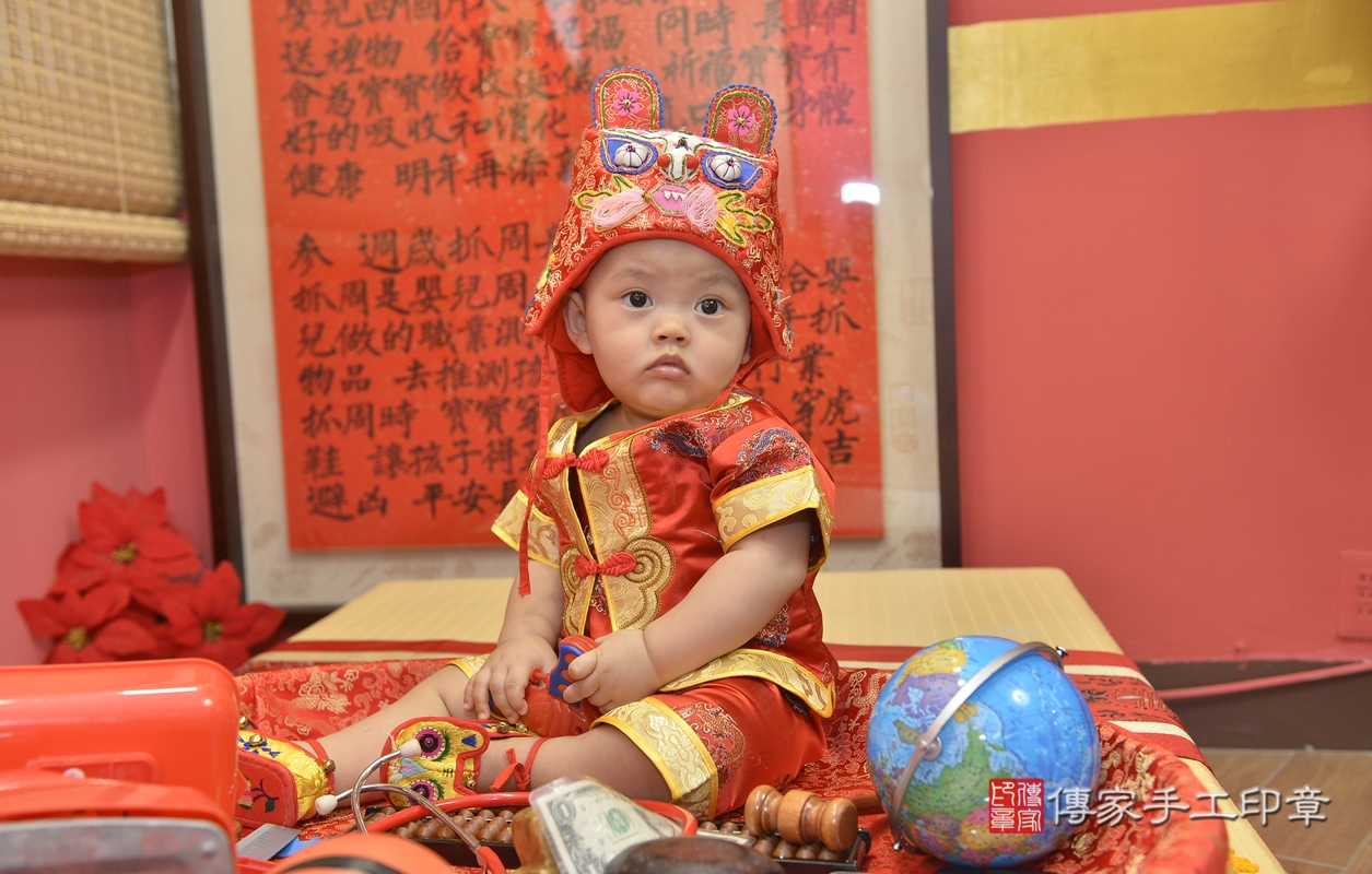 新北市永和區許寶寶古禮抓周【穿抓周虎衣、帶抓周虎帽、穿抓周虎鞋】:滿週歲趨吉避凶的吉祥衣服穿戴。新北店抓周。