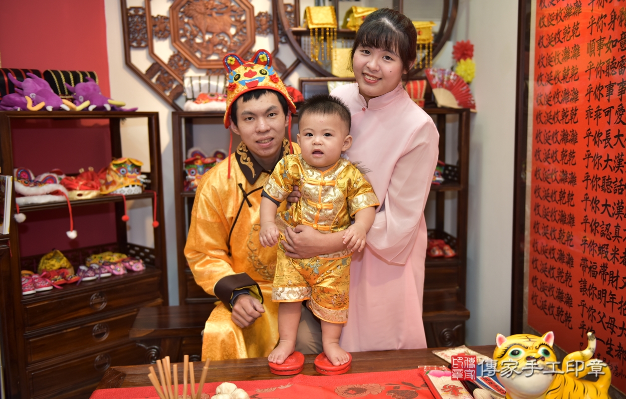 新竹市香山區洪寶寶古禮抓周【穿抓周虎衣、帶抓周虎帽、穿抓周虎鞋】:滿週歲趨吉避凶的吉祥衣服穿戴。新竹店抓周。