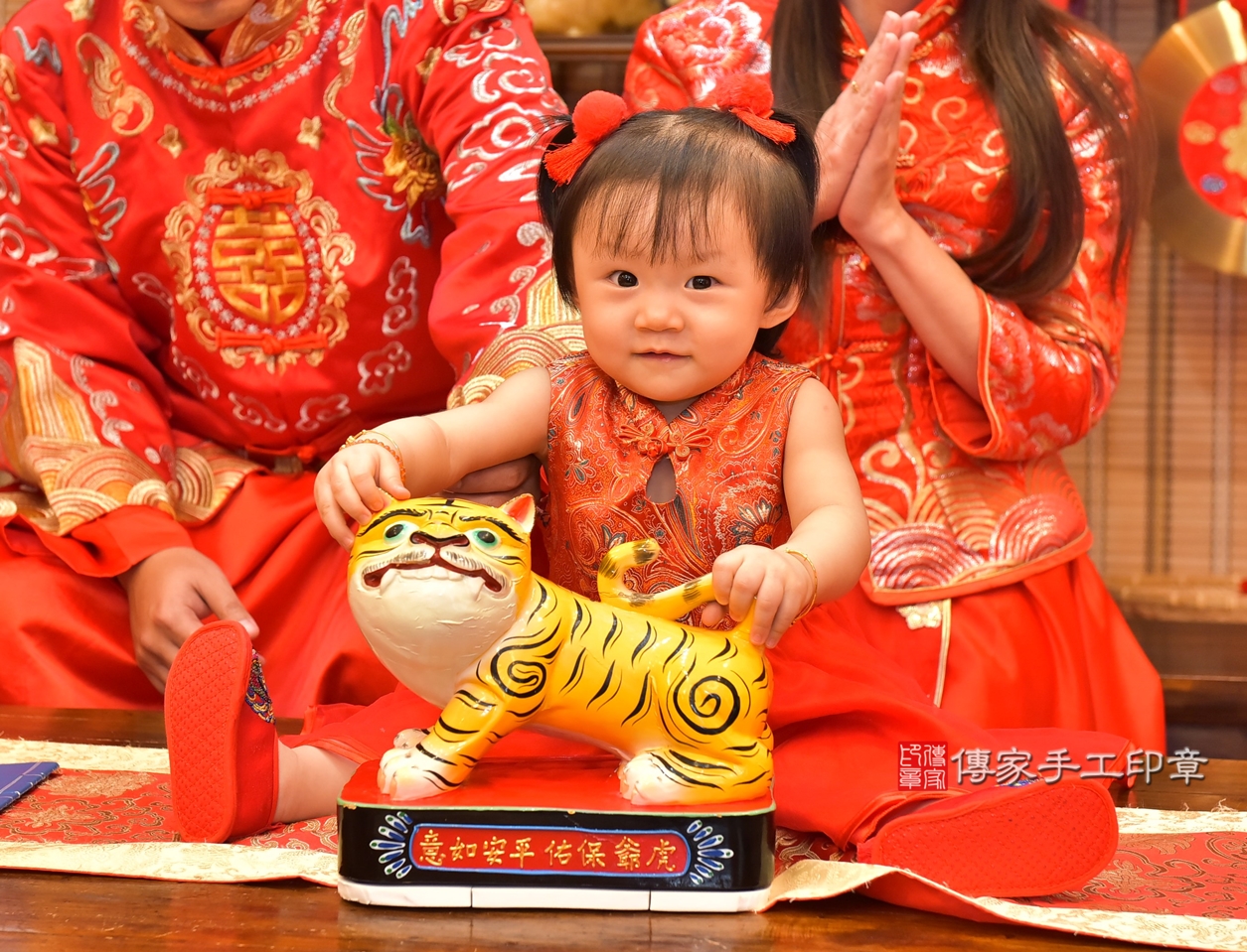 董寶寶抓周儀式【福虎歌】朗誦祝福:虎爺保佑寶寶吉祥,趨吉避凶。在中國和台灣,虎爺是兒童的守護神,週歲有虎爺保佑,可以象徵吉祥平安。高雄店抓周。