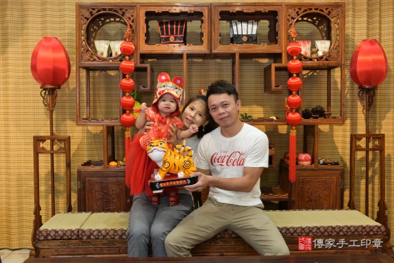 爸爸媽媽哥哥、長輩們和寶寶先來張大合照,留住這美好的時光。爸媽給寶寶挑一身復古大紅小洋裝,穿上虎鞋,全家頭頂都戴上虎帽,希望寶貝平平安安,趨吉避凶,護佑孩子健康成長。