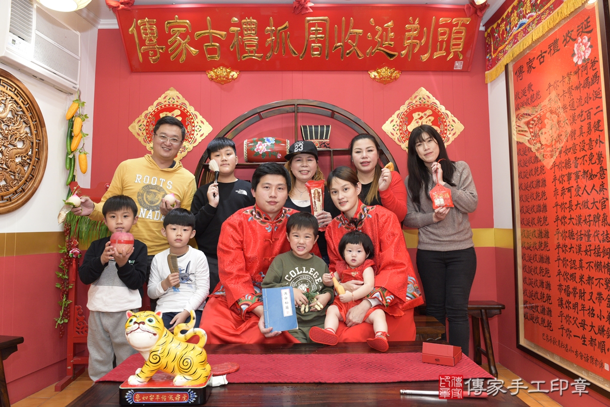 桃園市八德區薛寶寶抓周推薦:傳家桃園店抓周度脺中國風會場,嬰兒古禮抓周流程儀式吉祥話、抓周道具物品24種、拍照。抓周證書。2022.01.08