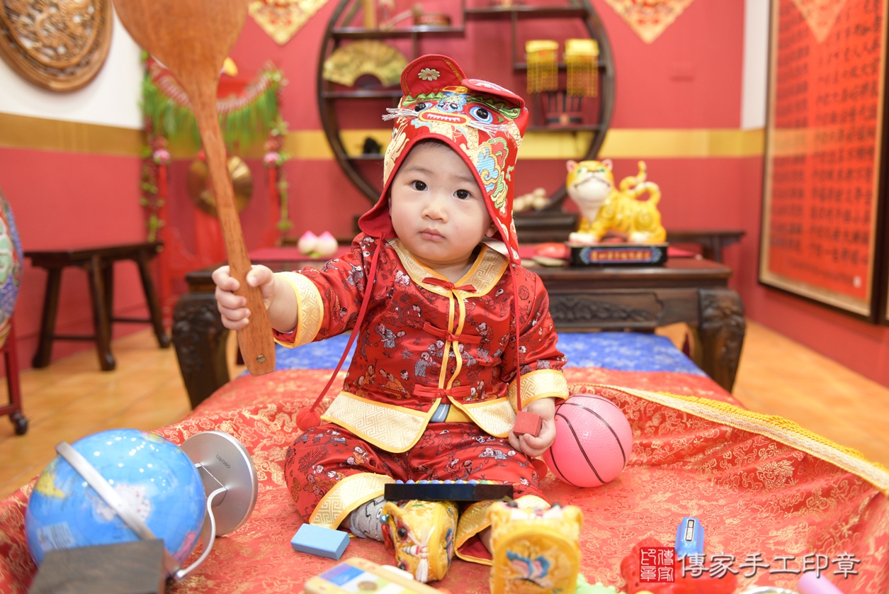 桃園市八德區李寶寶古禮抓周【穿抓周虎衣、帶抓周虎帽、穿抓周虎鞋】:滿週歲趨吉避凶的吉祥衣服穿戴。桃園店抓周。