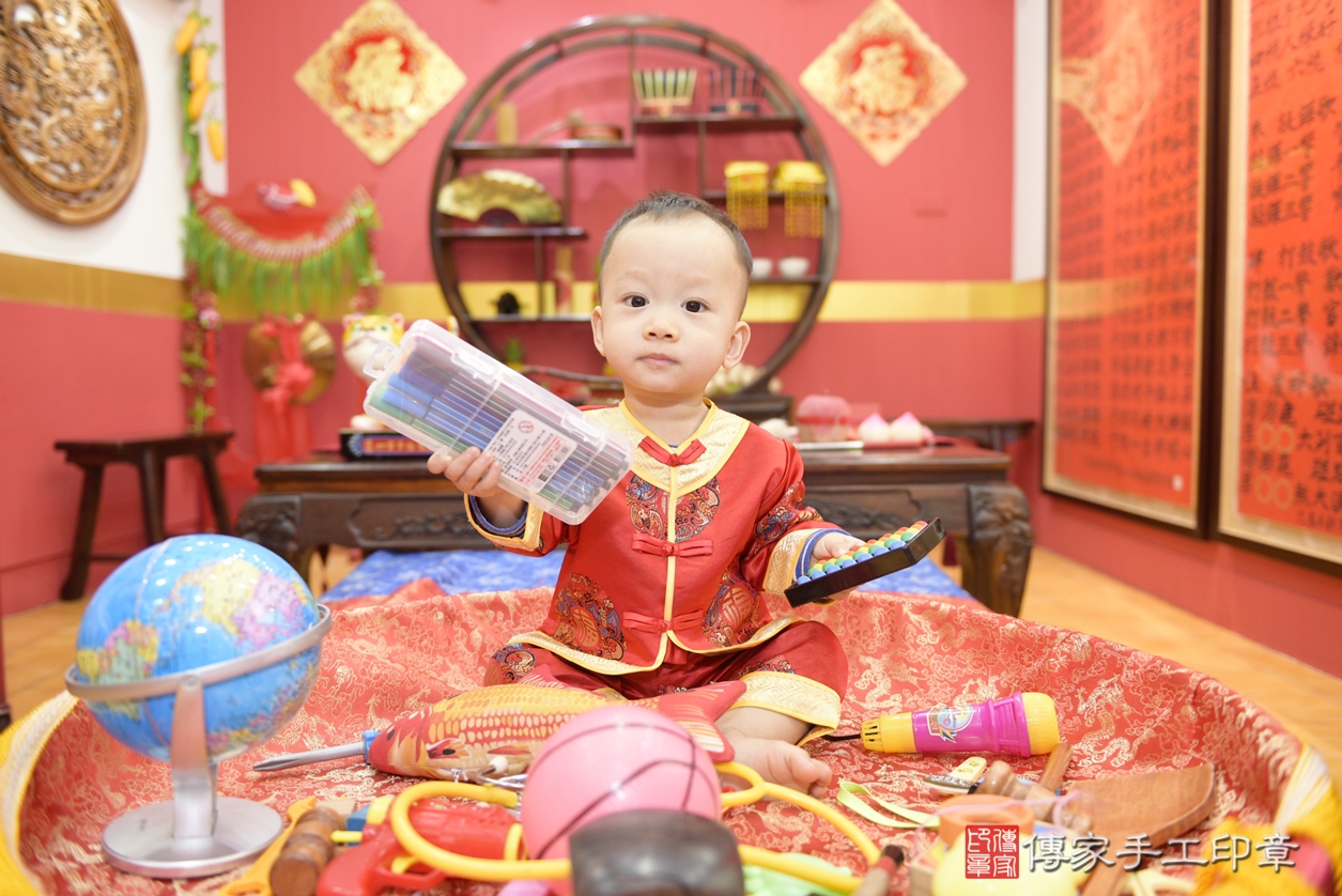 桃園市八德區嚴寶寶抓周推薦:傳家桃園店抓周度脺中國風會場,嬰兒古禮抓周流程儀式吉祥話、抓周道具物品24種、拍照。抓周證書。2022.02.18