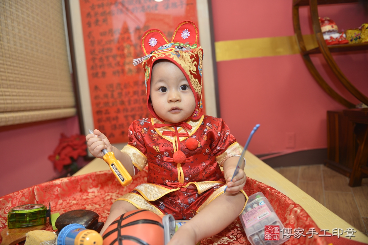新北市永和區江寶寶抓周推薦:傳家新北店抓周度脺中國風會場,嬰兒古禮抓周流程儀式吉祥話、抓周道具物品24種、拍照。抓周證書。2022.12.02