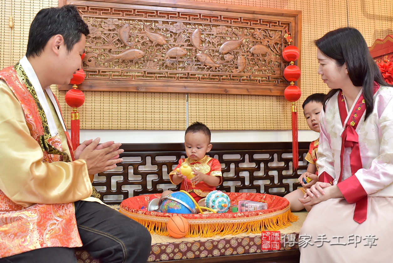 台南市永康區戴寶寶抓周推薦:傳家台南店抓周度脺中國風會場,嬰兒古禮抓周流程儀式吉祥話、抓周道具物品24種、拍照。抓周證書。2023.7.9