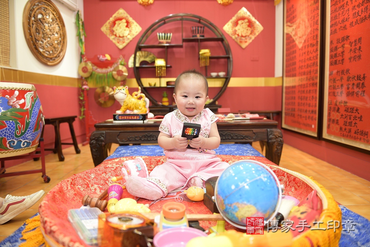 桃園市八德區鍾寶寶抓周推薦:傳家桃園店抓周度脺中國風會場,嬰兒古禮抓周流程儀式吉祥話、抓周道具物品24種、拍照。抓周證書。2022.12.29