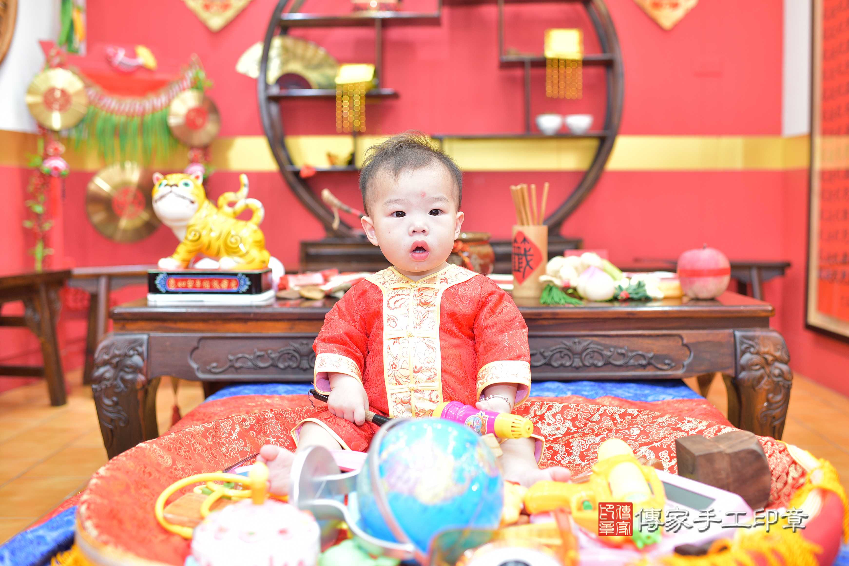桃園市八德區邱寶寶抓周推薦:傳家桃園店抓周度脺中國風會場,嬰兒古禮抓周流程儀式吉祥話、抓周道具物品24種、拍照。抓周證書。2023.06.21